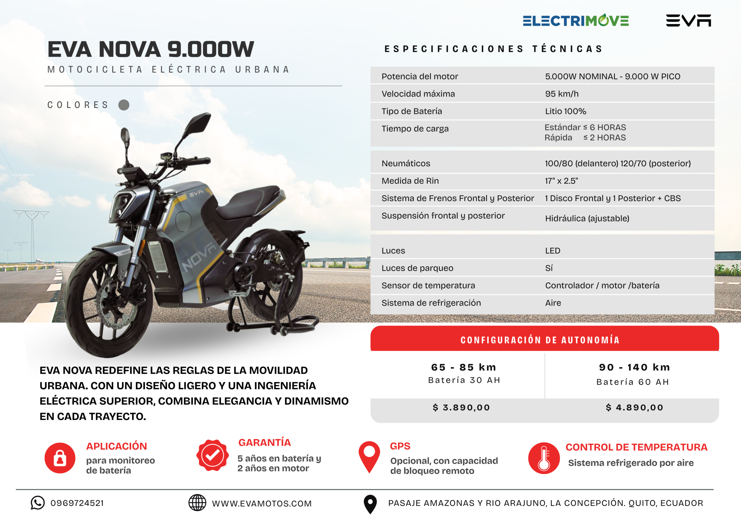 La EVA NOVA es una moto eléctrica deportiva de alta potencia, con un motor que alcanza picos de 9.000W. Ofrece una aceleración impresionante, es resistente al agua y cuenta con una batería de litio de hasta 60Ah, que proporciona una autonomía de hasta 140 km.